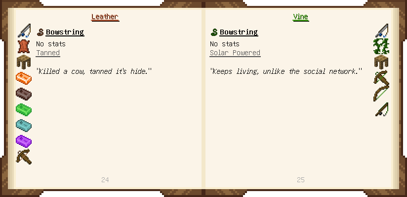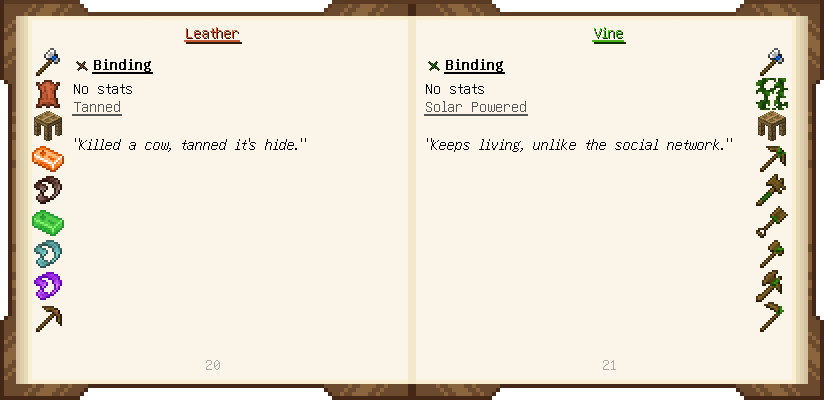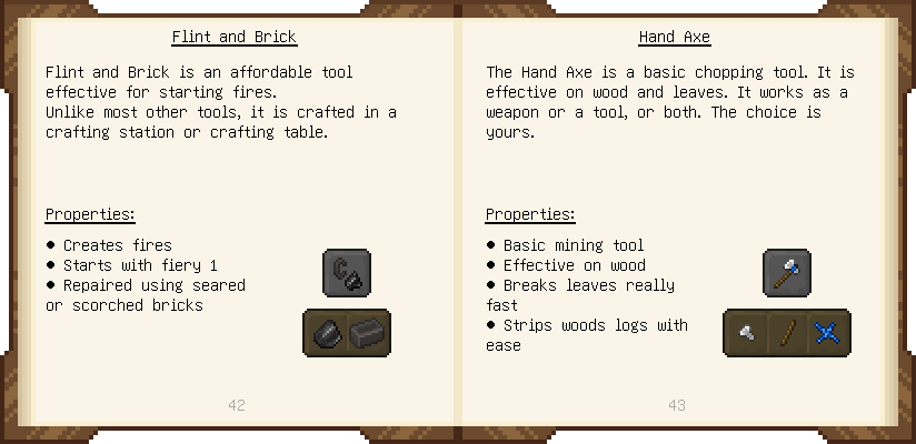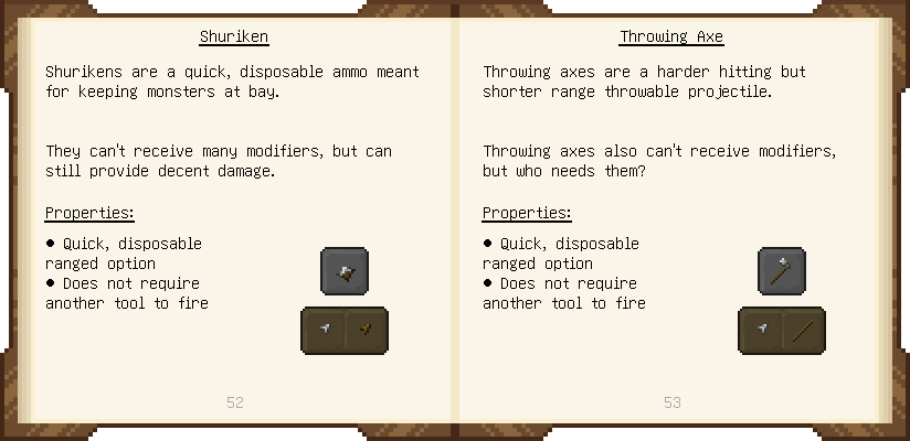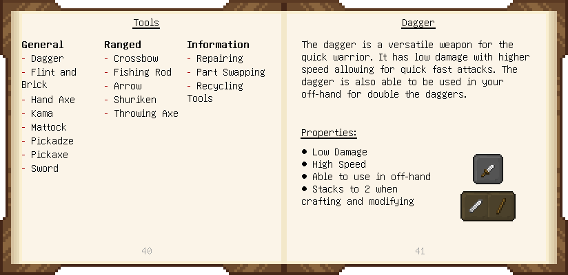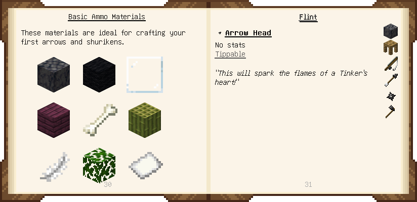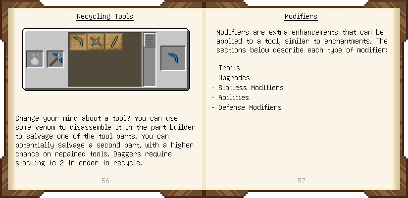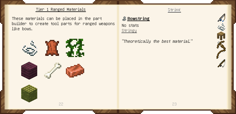 Home / Documentation / Book Index / 1.20 / Materials and You Materials and You (1.20) Puny Smelting See below for images of all pages in Materials and You. Click a page to view in gallery mode. Introduction Tier 1 General Tier 1 Ranged Basic Ammo Tools Modifiers Further Reading
