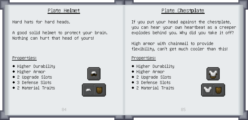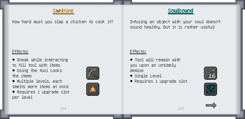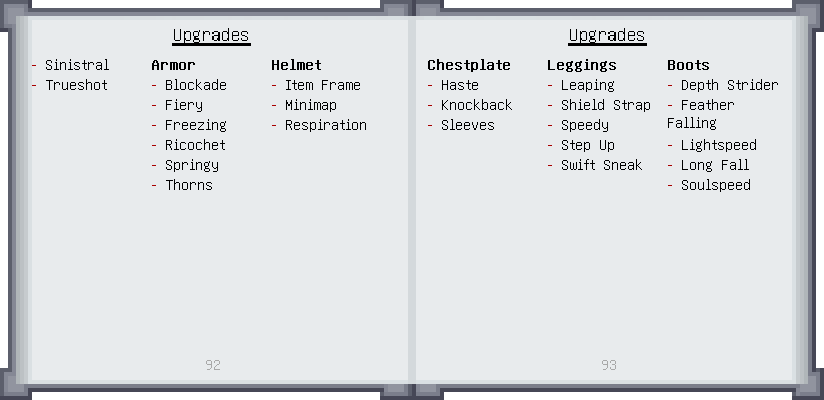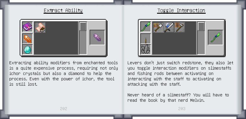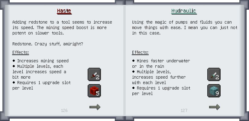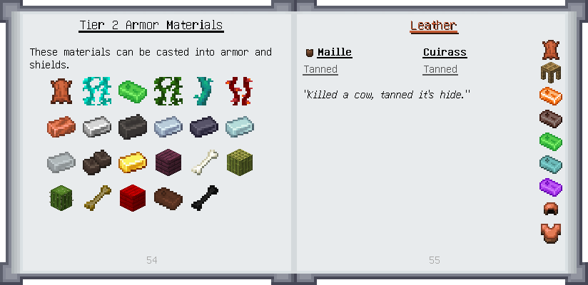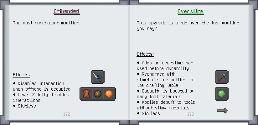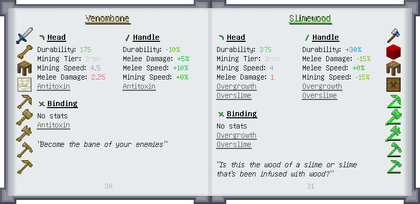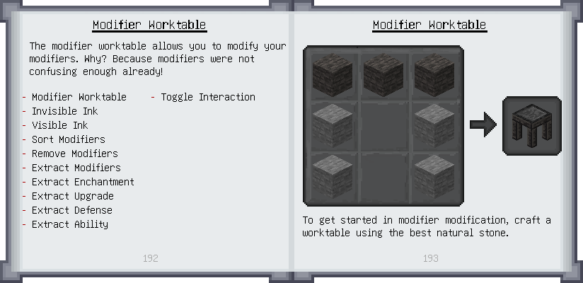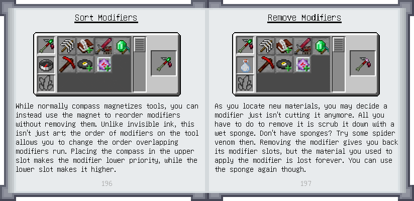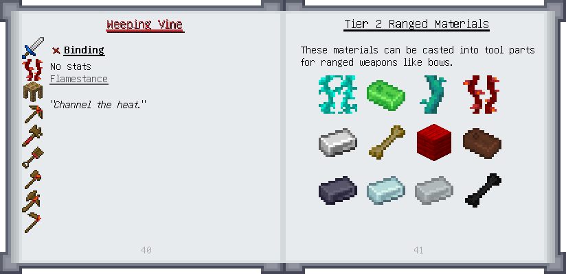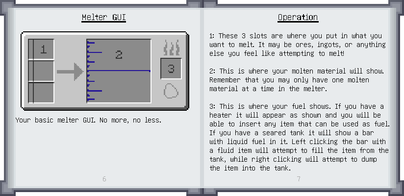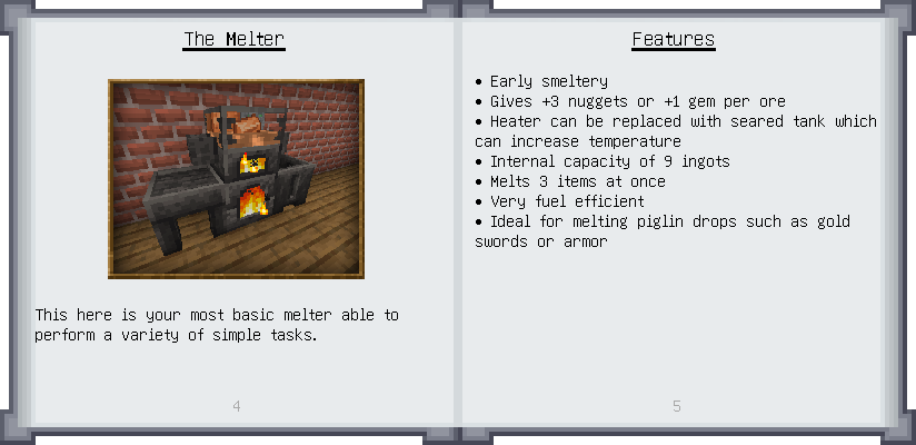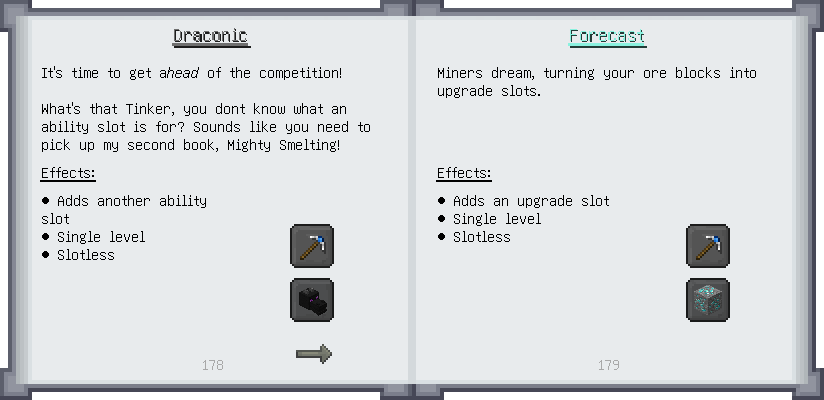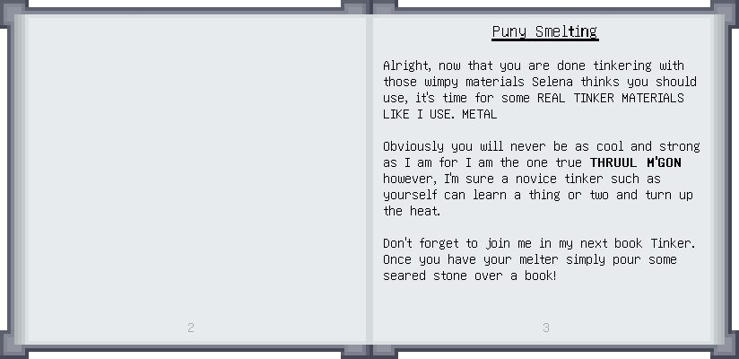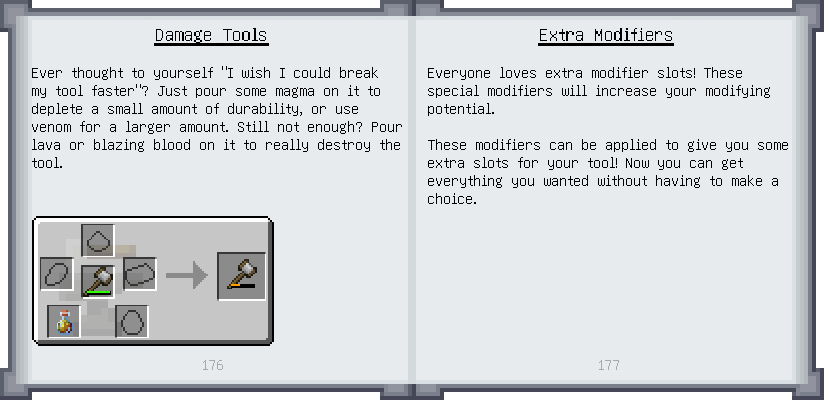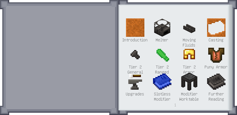 Home / Documentation / Book Index / 1.20 / Puny Smelting Puny Smelting (1.20) Materials and You Mighty Smelting See below for images of all pages in Puny Smelting. Click a page to view in gallery mode. Table of Contents Melter & Moving Fluids Casting Tier 2 General Tier 2 Ranged Tier 2 Armor Puny Armor Upgrades Slotless Modifiers Modifier Worktable Further Reading Melter & Moving Fluids Casting Tier 2 General Tier 2 Ranged Tier 2 Armor Puny Armor Upgrades Slotless Modifiers Modifier Worktable Further Reading