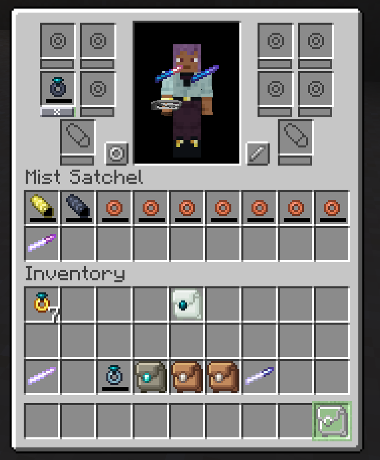 Mist satchels are an uncraftable satchel variant. Upon death, all metalminds and spikes are added to a mist satchel making it easier to gather them with a full inventory. Mist satchels only support item extraction, and disappear when emptied.