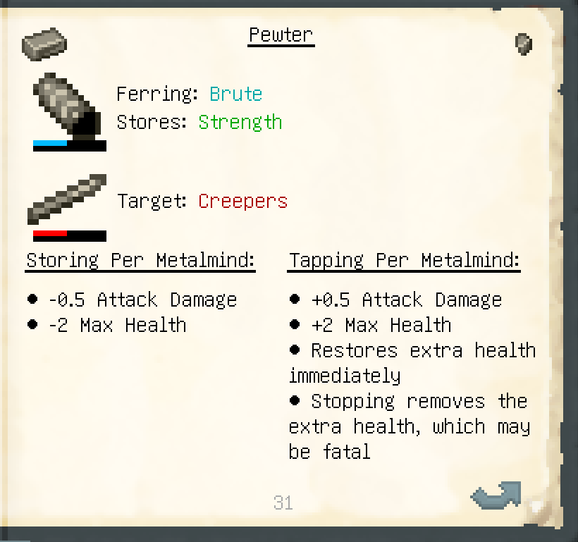 Pewter, constantan/brass, and iron all had adjustments to their powers. Pewter has the most notable changes as tapping grants less damage, but also grants some temporary instant health. Constantan/brass is notably more viable for combat, while iron is more useful when tapped.