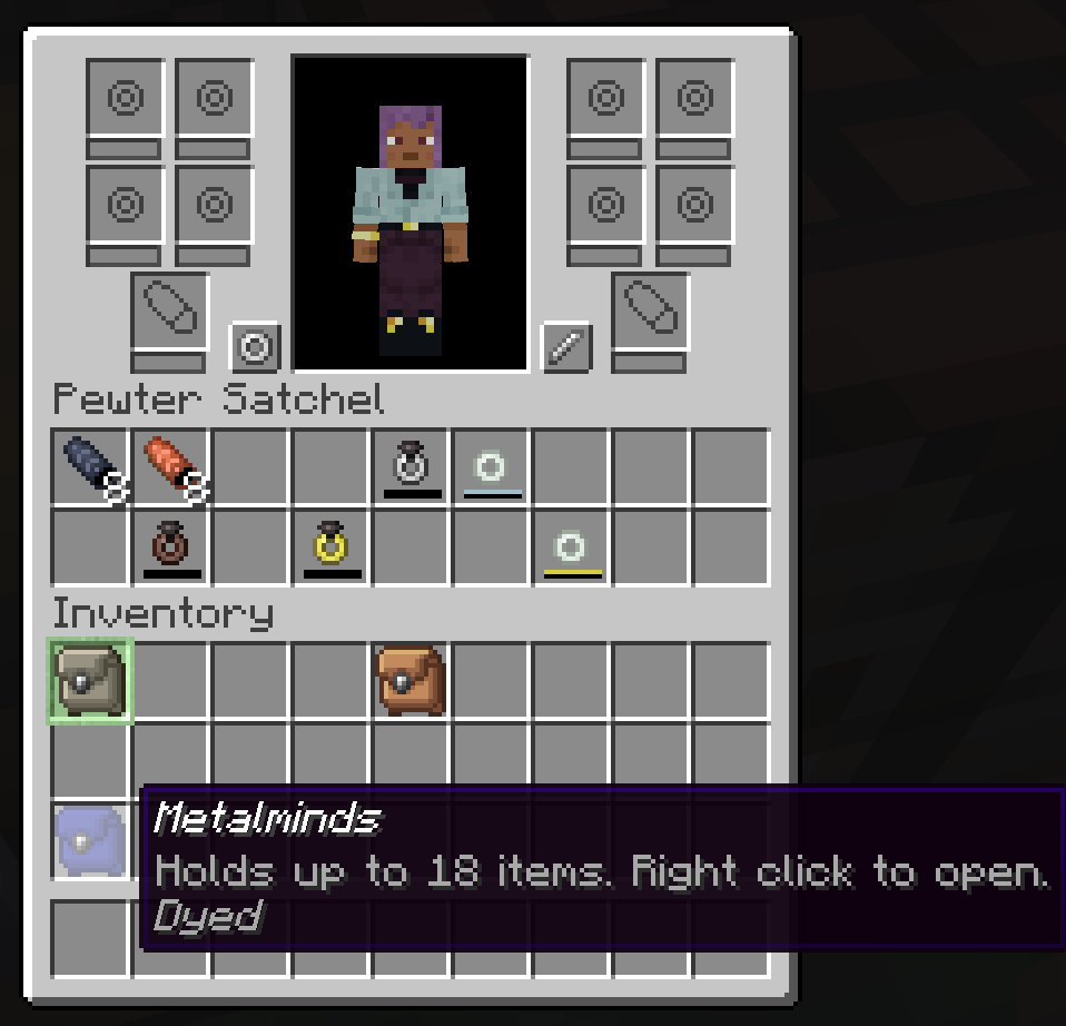 The first new feature in this update is satchels, which are a bag that can be used for convenient metalmind and spike storage. Unlike bags from other mods, opening the satchel UI gives you access to your ring, bracer, and spike slots. If you prefer, these bags can also be used for conventional item storage, though that can be disabled in the config.