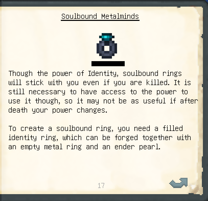 Nicrosil spikes and metalminds now store the name of the metal that matches the power they contain. This both helps with JEI searches, and to help you remember the matching metal without looking it up.